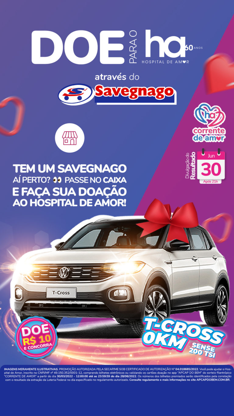magina doar R$10 pra ajudar a salvar vidas e ainda concorrer a 1 T-Cross Sense ZERO quilômetro? 🚗💨 É isso mesmo! O Corrente de Amor é uma campanha que torna isso possível! Você ajuda o Hospital de Amor e pode levar pra casa o carro dos sonhos. O resultado do sorteio será realizado dia 30 de junho.